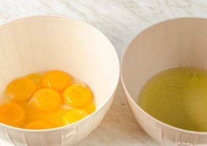 2. Яйца разбиваем, отделяем белки от желтков. В белки не должны попасть желтки, жир или вода - от этого будет зависеть, насколько хорошо взобьются белки.
