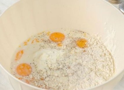 3. К желткам добавляем сметану, молоко, муку, соль и черный перец.