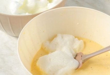 6. Порциями, по 2-3 лопатки, аккуратно вмешиваем взбитые белки в желтковую массу.