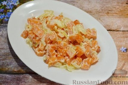 5 Соединяем тыкву и жареный лук. Заправляем салат майонезом, добавляем соль и черный перец по вкусу.