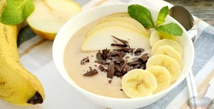 12. Разлейте пудинг по тарелкам, украсьте крупно порубленным шоколадом, кружочками банана и ломтиками груш.