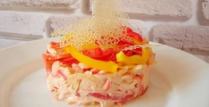 8. Подаем салат порционно, украшая перцем и приготовленным чипсом.