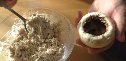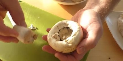 1. Для рецепта берем крупные шампиньоны. Вырезаем у грибов ножку и немного вычищаем внутри шляпки. Стараясь шляпку шампиньона не повредить.