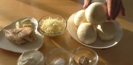 2. Жареную грудку, грибные ножки нарезаем мелким кубиком. Добавляем натертый сыр, соль, перец, измельченный чеснок и сметану. Хорошо перемешиваем и начинка готова!