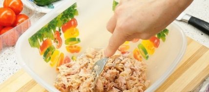 1 Баночку тунца в масле выкладываем в миску и разминаем вилкой. Я выкладываю рыбу вместе с маслом. Если тунец в собственном соку, то жидкость можно слить, а можно оставить в салате - как хотите.