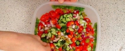 9 Отваренные макароны отправляем в миску к остальным ингредиентам и перемешиваем. Если тунец был без масла, то сдабриваем салат любым растительным маслом.