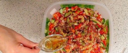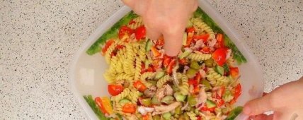 Очень вкусный тёплый салат, сочетающий в себе свежесваренную пасту, свежие овощи, приправы и консервированные ингредиенты. Отличный вариант для сытного перекуса.