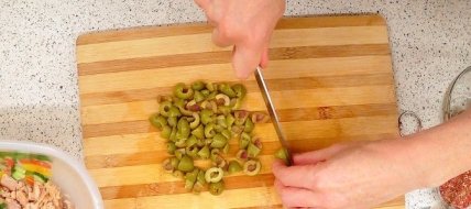 3 Оливки нарезаем на 2 или 4 части. Или кладём в салат целиком. Я использую целую мягкую упаковку оливок.