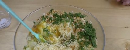 4 Укроп мелко нарезаем и тоже добавляем к картофельному пюре. Сюда же - яйца, соль и чёрный молотый перец. Хорошо перемешиваем.