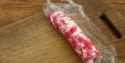 5 Очень осторожно, начиная с одного края, сверните творожную массу с черносливом в рулет, чтобы чернослив оказался внутри. Подверните края пленки и сформируйте аккуратную "колбаску".
