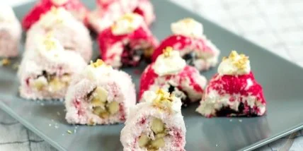 Десертное блюдо из творога с сухофруктами и бананами, лишь внешне похожее на роллы из восточной кухни.