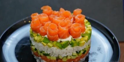 5. Собираем салат: первый слой рис с нори, красная рыба кубиками, огурец, рис, авокадо, красная рыба слайсами в форме розочек. На каждый слой выкладываем немного сливочного сыра. Авокадо и красную рыбу розочками советую выкладывать непосредственно перед подачей, чтобы авокадо не темнел, а рыба не заветривалась. Подаем с соевым соусом, васаби и имбирем.