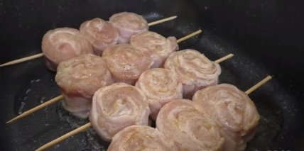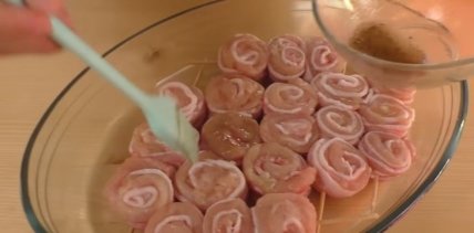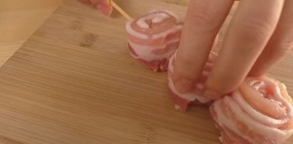 Подготовленную грудку нарезаем на полоски шириной с бекон. На каждую куриную полоску выкладываем полоску бекона и заворачиваем плотную улитку (розочку).