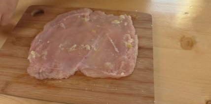 Куриное филе разрезаем на пополам, на пластики. Отбиваем (через пленку) почти до толщины бекона. Присолили и промажем чесноком (пропущенный через пресс).