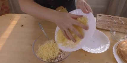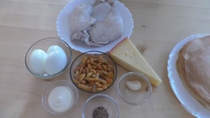 Рецепт очень вкусного куриного, блинного торта с грибами.