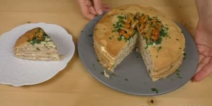 Рецепт очень вкусного куриного, блинного торта с грибами.