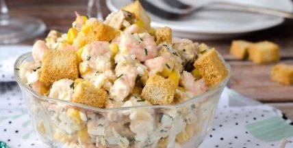 Новогодний рецепт: салат с креветками, кукурузой, яйцами и сухариками