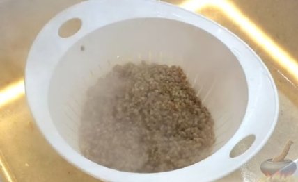 Промываем очищенную шлифованную пшеницу под проточной холодной водой 4-5 раз. (Если мыть пшеницу в горячей воде, то зерно будет запариваться, и в результате после варки мы получим густую кашу, а не рассыпчатую пшеницу.) Откидываем пшеницу на дуршлаг, чтобы стекла лишняя вода.