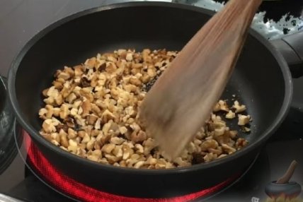 Орехи рубим ножом и отправляем на сковородку. Обжариваем орехи на сухой сковороде.