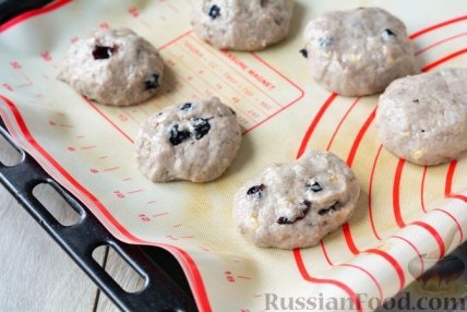 10 Включить духовку для разогрева до 180 градусов. Противень застелить силиконовым ковриком или пергаментом. Смоченными в воде руками скатать из теста шарики, выложить на подготовленный противень и приплюснуть ладонью.