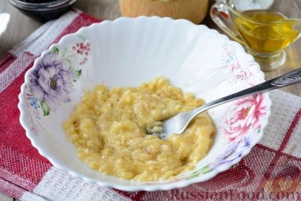2 При помощи вилки размять банан в пюре. Важно, чтобы банан был мягким.