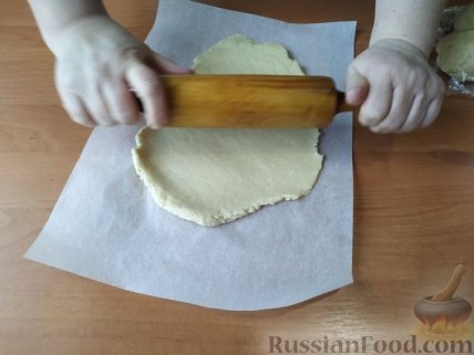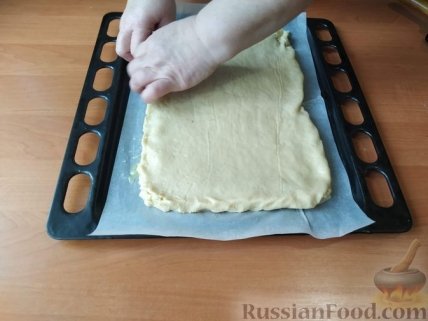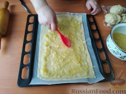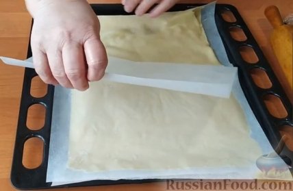 12 Пласт теста вместе с пергаментом перекладываем на противень. Выкладываем на тесто половину начинки.