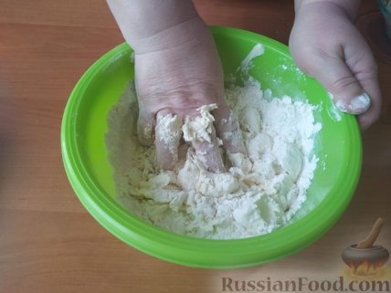 3 Добавляем масло в предварительно просеянную муку, всыпаем соль. Перетираем муку с маслом в крошку.