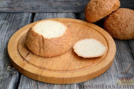 6 Извлеките мякиш, сохранив корочку толщиной не более 1 сантиметра. Верхушки булочек и хлебный мякиш в этом рецепте нам не понадобятся - из них можно сделать панировочные сухари, добавить их в котлетный фарш или даже сделать хлебные котлетки.
