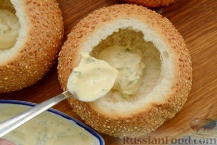 7 Выложите в каждую булочку примерно по 1 ст. ложке соуса и распределите тыльной стороной ложки по внутренней поверхности булок.