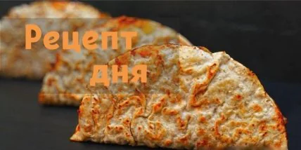 5.Перевернуть лепешку, смазать кетчупом, посыпать луком, маринованным огурцом, сыром. Свернуть лепешку пополам. Обжарить с каждой стороны по 1-2 минуте.