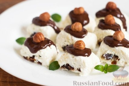Нежный десерт, который готовится из мягкого творога с добавлением фиников и рубленого фундука. Если украсить такие творожные конфеты шоколадом, фундуком и листиками мяты, получится вполне праздничное угощение.