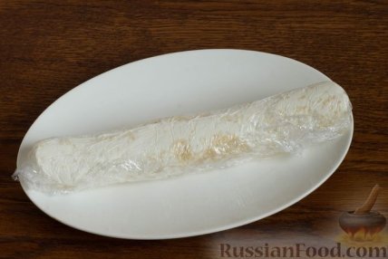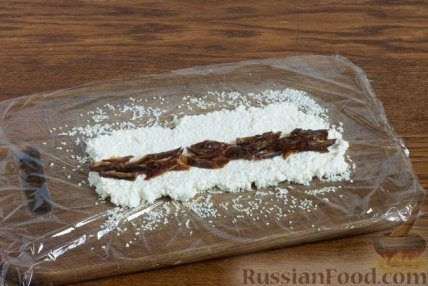6 Поднимая края плёнки, аккуратно сверните творожный слой в рулет. На 20-30 минут поставьте в холодильник.