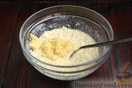 5 Банановую кашицу добавьте в миску к овсянке, молоку и яйцу. Перемешайте до однородности.