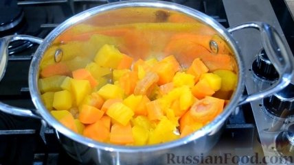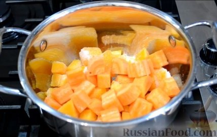 1 Мякоть тыквы нарезаем кубиками. У меня замороженная, уже нарезанная тыква. Помещаем тыкву в кастрюлю.