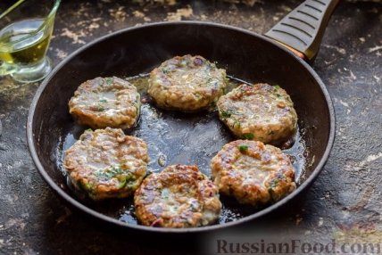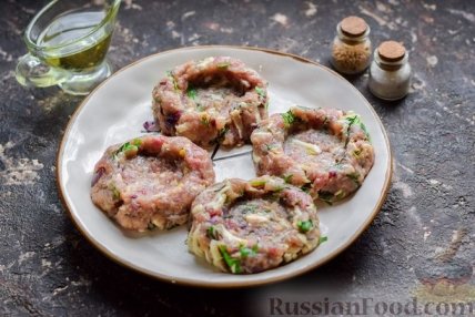 6 На разогретую сковороду влейте растительное масло и выложите подготовленные "гнёзда" из фарша, обжарьте с каждой стороны по 3 минуты, начиная со стороны с углублением.