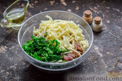 3 В миску с фаршем добавьте сыр, укроп, петрушку, соль, молотый перец и паприку.