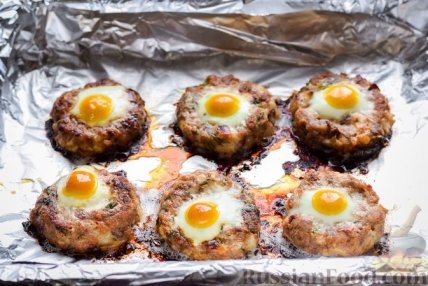 8 Мясные котлеты, запечённые с перепелиными яйцами, готовы.
