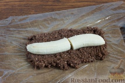 6 Разделочную доску оберните пищевой пленкой. Выложите туда половину полученной шоколадной массы. Разровняйте так, чтобы получился прямоугольник по длине равный длине очищенного банана.