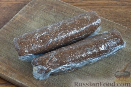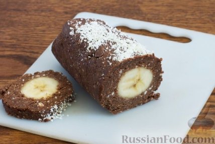 Рецепт дня: Творожный десерт без выпечки с бананами7 Аккуратно оберните банан шоколадной массой, приподнимая плёнку. Сформированный шоколадно-творожный рулет с вафлями и бананом в плёнке поставьте в холодильник на 3-4 часа. Точно так поступите с оставшейся шоколадной массой и вторым бананом.