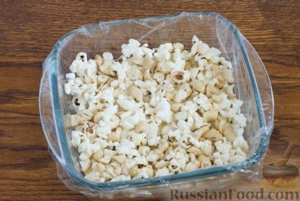 4 Пока шоколад не застыл, равномерным слоем выложите попкорн и измельченные кешью. Слегка вдавите попкорн и орехи в мягкий шоколад.