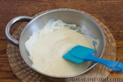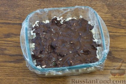 3 Форму (моя - размером 15х15 см) застелите пищевой плёнкой и вылейте в неё растопленный белый шоколад.