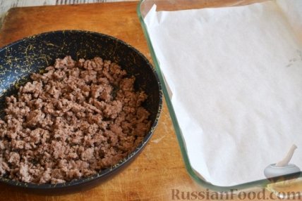 3 В сковороде разогреваем растительное масло. Выкладываем фарш в сковороду и, постоянно помешивая, обжариваем на среднем огне примерно 5-7 минут, до готовности и побеления фарша. Во время обжаривания солим и перчим мясо по вкусу. Включаем духовку разогреваться до 190 градусов. Дно формы для запекания застилаем пергаментной бумагой.