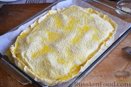 11 Пирог смазываем яйцом и посыпаем кунжутом.