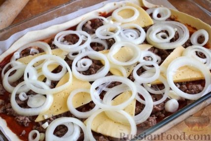 7 На фарш так же равномерно выкладываем лук и половину сыра (примерно 55 г).