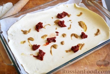 6 Тщательно распределяем горчицу и томатную пасту по всей поверхности теста и так же равномерно выкладываем фарш.