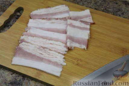 4 Бекон нарезать слайсами, которые по длине будут соответствовать надрезам на куриных грудках.