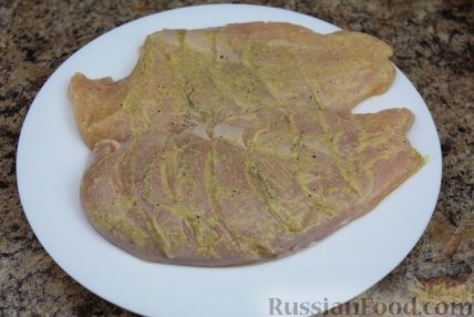 2 Куриное филе посолить, поперчить и обмазать со всех сторон горчицей. Оставить на 20 минут.