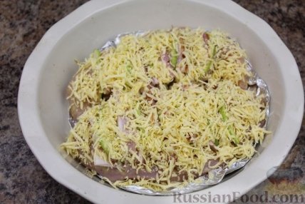 7 Посыпать фаршированные куриные грудки с беконом и яблоком тёртым сыром. Отправить в духовку на 30 минут.