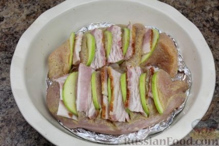 6 Включить духовку для разогрева до 180 градусов. Форму для запекания застелить фольгой или смазать растительным маслом. Выложить куриные грудки в форму. В каждый надрез на куриной грудке вставить по слайсу бекона и по ломтику яблока.
