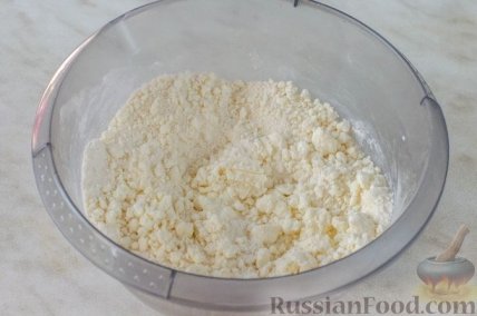 2 Соединяем муку, сахар, творог, соль и разрыхлитель теста.